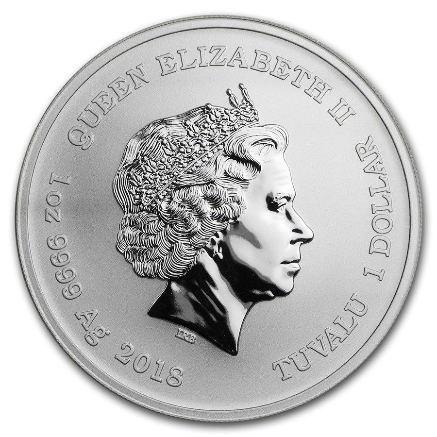 Аверс монети прикрашений портретом Її Величності Королеви Єлизавети II. Навколо зображення розташовані написи: «QUEEN ELIZABETH II», «TUVALU 1 DOLLAR», «2018», «1 oz 9999 Ag». Дзеркальне тло й рельєфне зображення створюють гармонійне поєднання класичного стилю та сучасної нумізматичної елегантності.