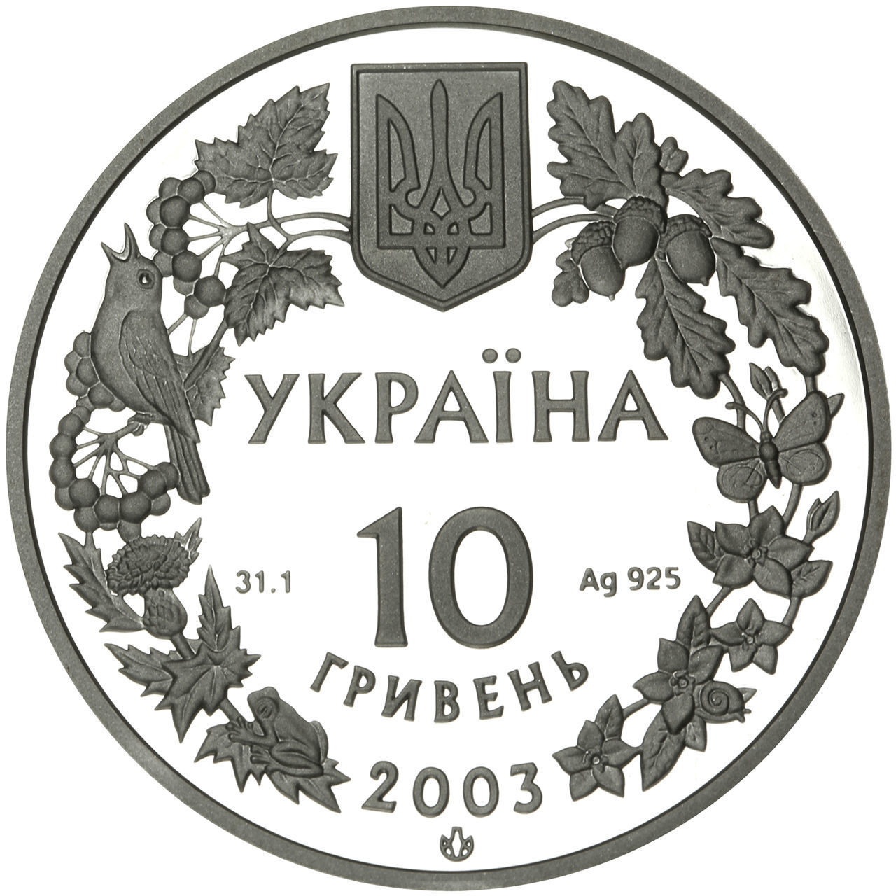 На аверсі монети в обрамленні вінка, утвореного із зображень окремих видів флори і фауни, розміщено малий Державний Герб України та написи в чотири рядки: на монеті із срібла – УКРАЇНА, 10 ГРИВЕНЬ, 2003, а також позначення металу та його проби – Ag 925, вага в чистоті – 31,1 та логотип Монетного двору Національного банку України