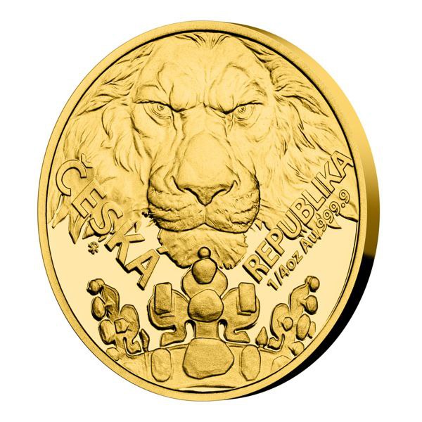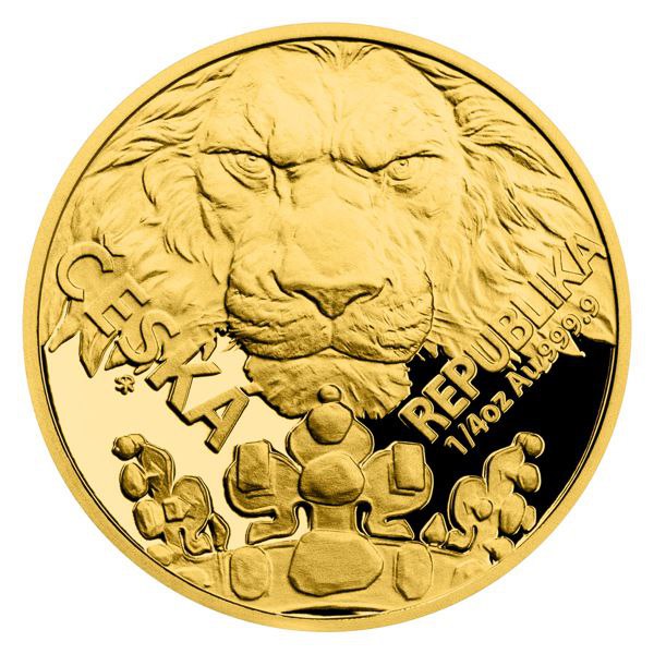 Реверс монети демонструє величного лева з короною Святого Вацлава — національного символу Чехії. Потужний погляд тварини передає силу й гідність, а під короною видно стилізований чеський державний герб. Написи «ČESKÁ REPUBLIKA» та «1/4 oz Au .9999» вказують на країну-емітента, вагу та чистоту дорогоцінного металу.