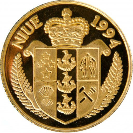 На аверсі зображено герб Ніуе, увінчаний королівською короною та оточений декоративними гілками, а також вказаний рік випуску – 1994. Такий дизайн підкреслює офіційний статус і високу художню цінність монети.