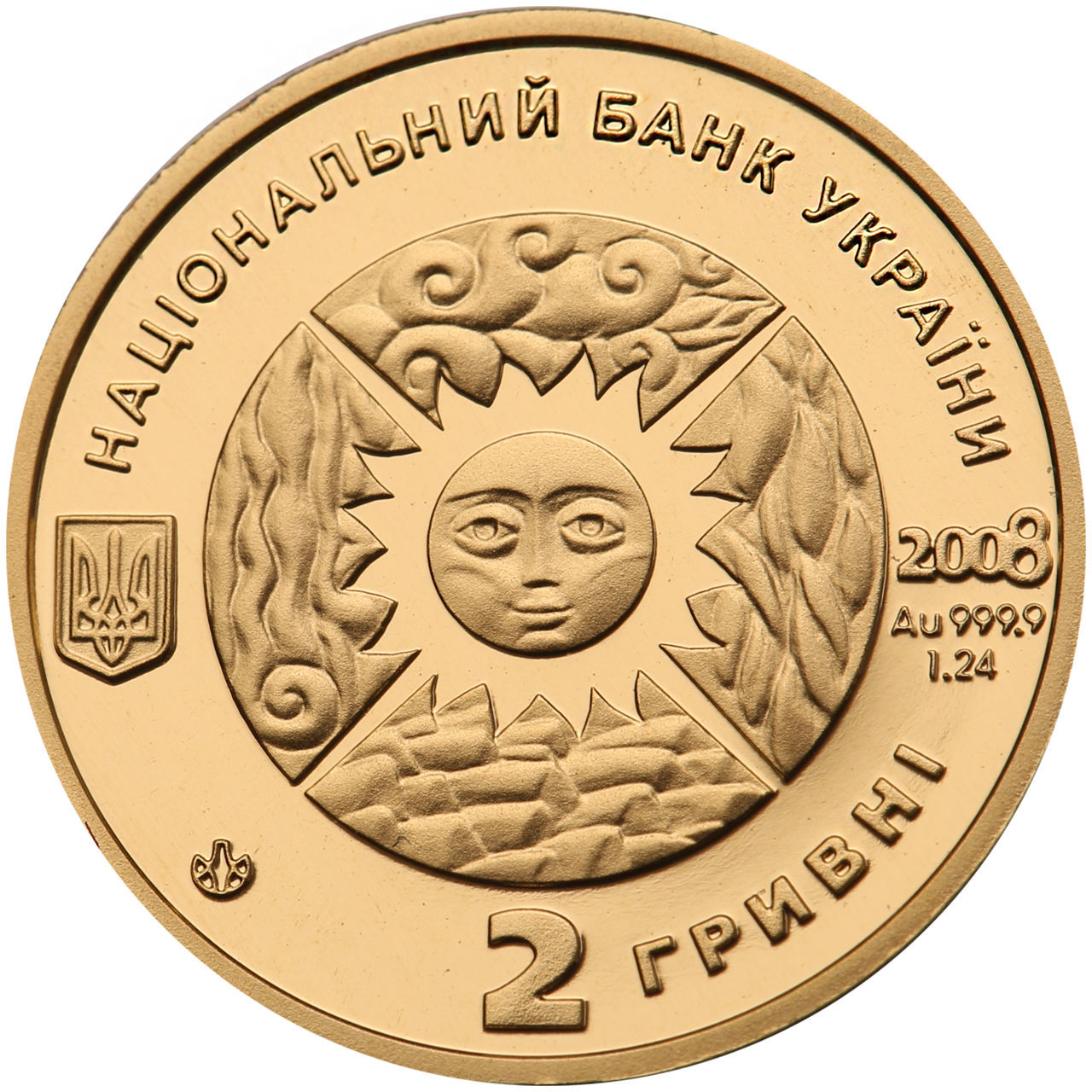 На аверсі монети розміщено коло, діагонально поділене на сектори, які символізують чотири стихії: землю, повітря, воду, вогонь, у центрі кола – стилізоване зображення сонця. Ліворуч від кола – малий Державний Герб України, праворуч – рік карбування монети 2008, позначення металу, його проби Au 999,9, маси 1,24, по колу монети – написи: НАЦІОНАЛЬНИЙ БАНК УКРАЇНИ (угорі), 2 ГРИВНІ (унизу), а також логотип Монетного двору Національного банку України.