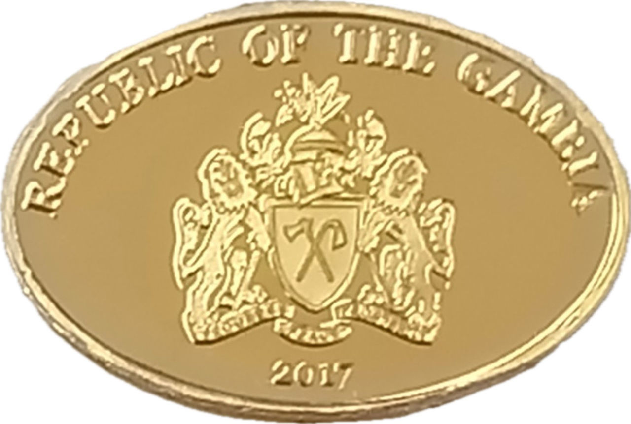 Лицьова сторона монети прикрашена гербом Республіки Гамбія, що символізує державність і національну гордість країни. У центрі герба зображений щит із сокирою та мотикою, які вказують на сільськогосподарську спадщину Гамбії. Щит утримують два леви, а зверху розташований шолом як символ сили й захисту. Завершують композицію написи «REPUBLIC OF THE GAMBIA» та рік випуску — «2017».