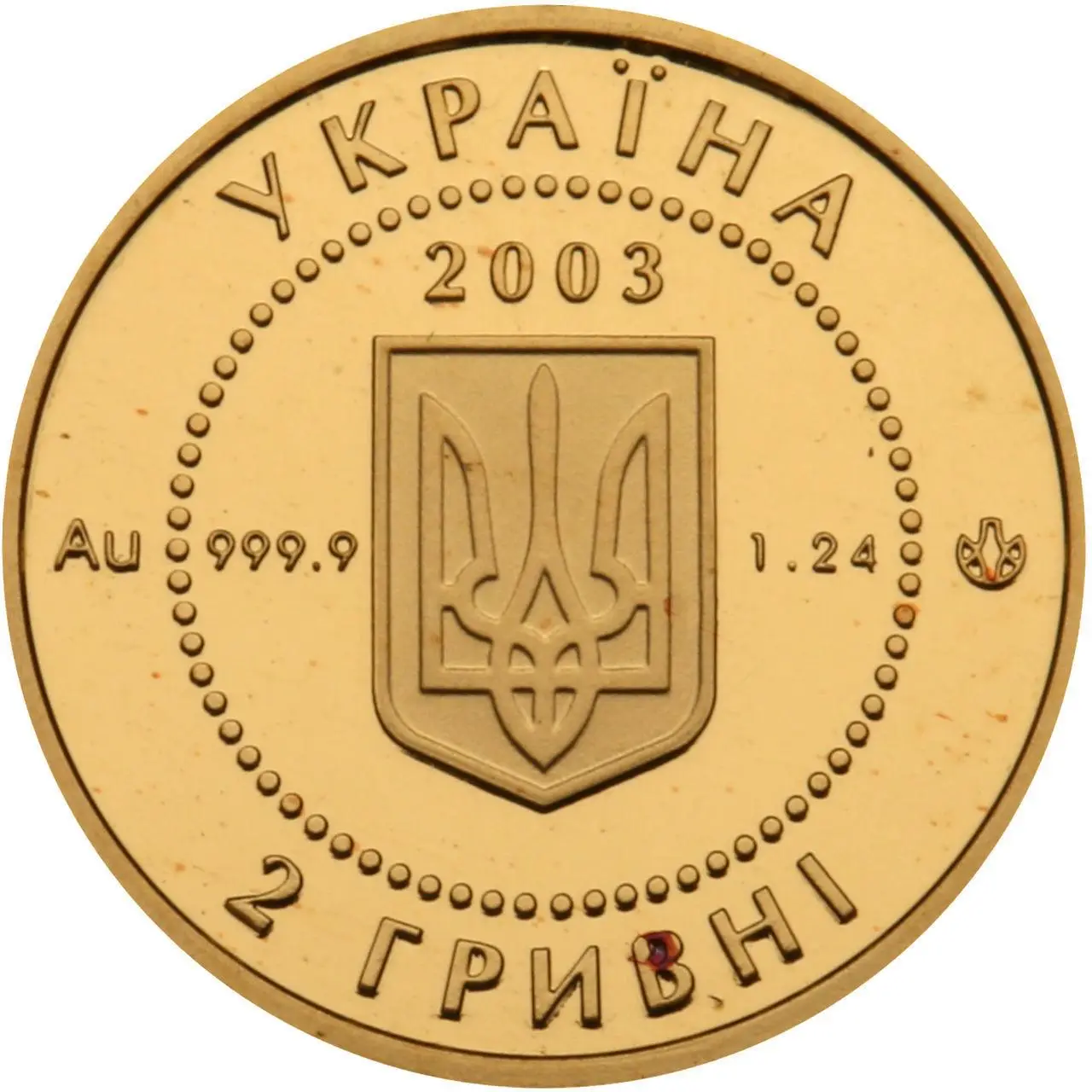 У центрі бусинкового кола розміщено малий Державний Герб України, над яким викарбувано рік випуску — 2003. По колу розташовані написи: угорі — «УКРАЇНА», унизу — «2 ГРИВНІ». Ліворуч зазначено метал і його пробу — «Au 999,9», праворуч — масу «1,24» та логотип Монетного двору НБУ.