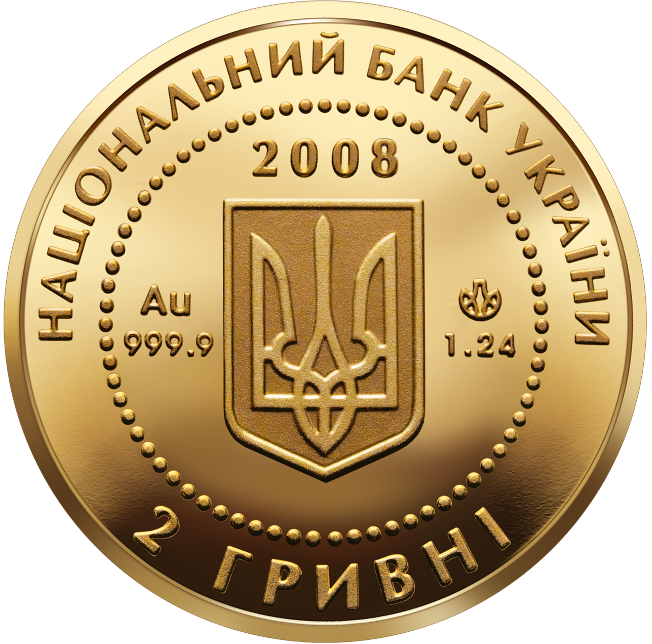 На аверсі монети зображено малий Державний Герб України у центрі композиції, над яким вказано рік випуску — 2008. Ліворуч розміщено хімічне позначення металу — Au, пробу 999.9, а праворуч — логотип Монетного двору НБУ та вагу дорогоцінного металу — 1,24 г. Навколо зображення проходить напис: «Національний банк України», унизу розташований номінал — 2 гривні.