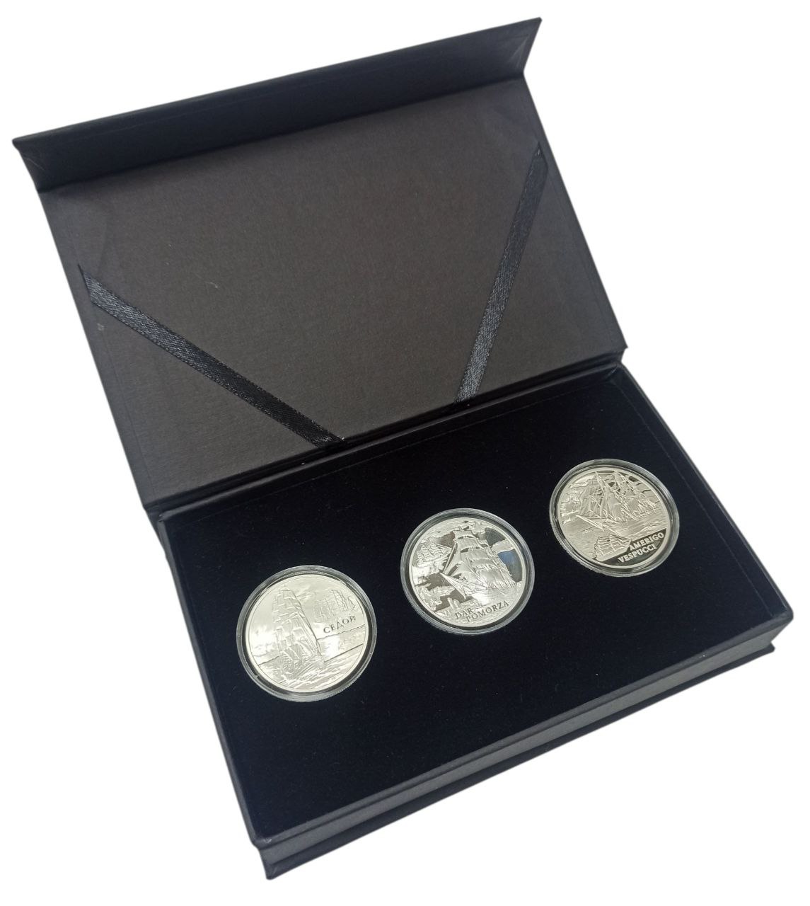 Цей колекційний набір об’єднує три пам’ятні срібні монети, присвячені легендарним вітрильникам та мореплавству випущені Республікою Білорусь. Усі монети красиво розміщені в елегантній чорній подарунковій коробці з оксамитовим ложементом, що робить набір ідеальним вибором для колекціонерів та поціновувачів морської історії та унікального нумізматичного дизайну.