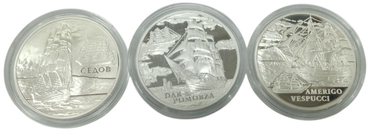 На аверсах трьох монет зображені відомі історичні вітрильники: на першій монеті зображено корабель «Седов» з написом «СЕДОВ»; на другій — легендарний польський вітрильник «Dar Pomorza» з написом «DAR POMORZA»; на третій — італійський навчальний корабель «Amerigo Vespucci» з написом «AMERIGO VESPUCCI». Кожна монета виконана з високим рівнем деталізації, передаючи красу та велич морських суден.