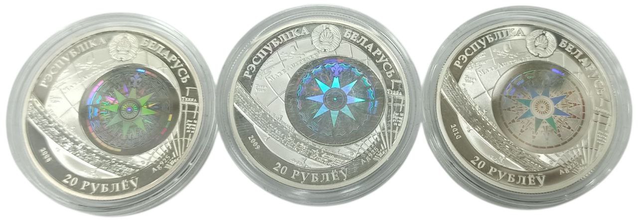 На реверсах трьох монет Республіки Білорусь розташовано зображення державного герба та складний композиційний дизайн із зображенням карти світу, морських координат і великим голографічним знаком компаса в центрі. Навколо розміщені написи «РЭСПУБЛІКА БЕЛАРУСЬ», номінал «20 РУБЛЁЎ» та рік випуску «2008», «2009» або «2010» залежно від монети. Голографічні елементи створюють унікальний візуальний ефект і символізують морську навігацію.