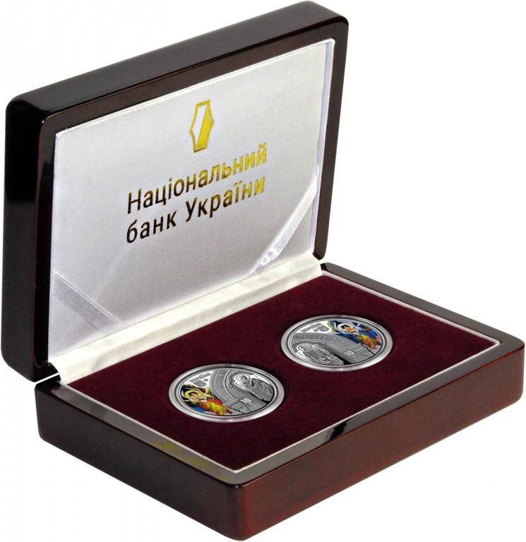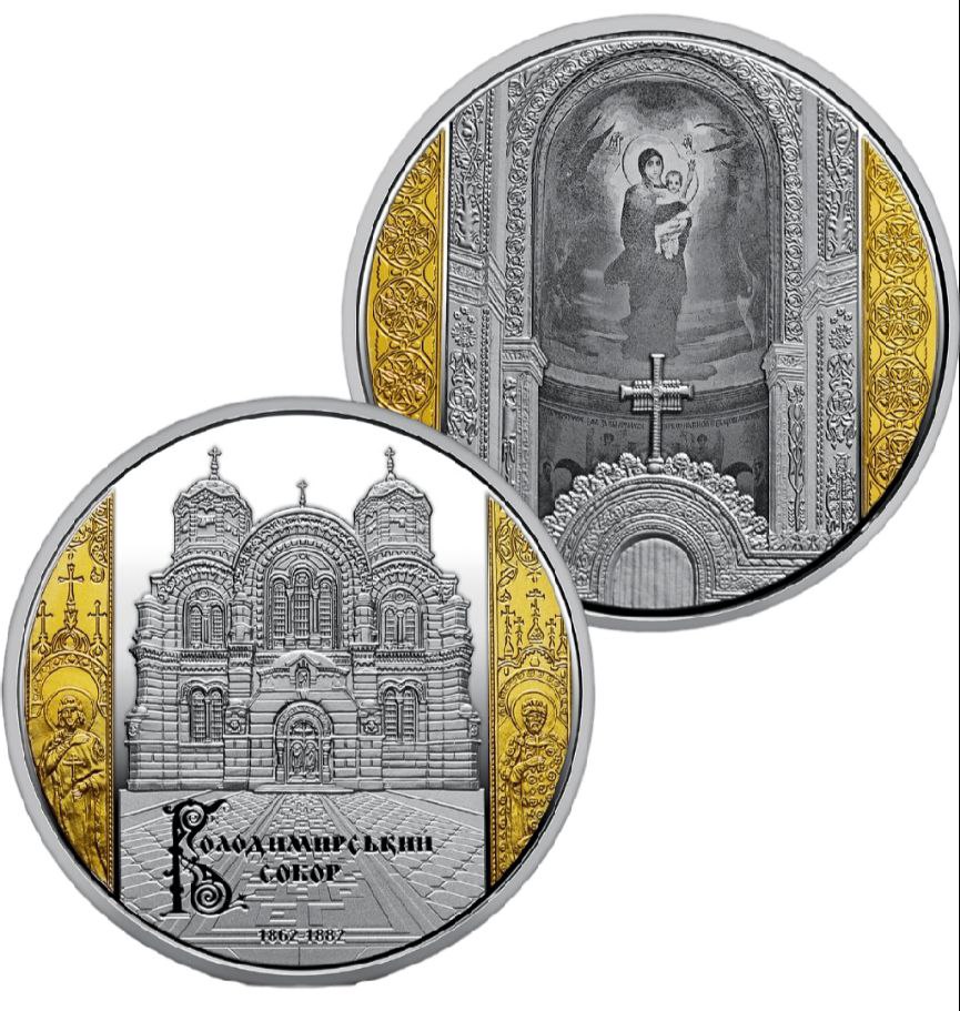 Набір із двох пам’ятних монет присвячений одній з архітектурних перлин Києва національного значення – Володимирському собору. Побудований у неовізантійському стилі, він привертає увагу як своєю історією, так і внутрішнім розписом – справжнім шедевром мистецтва. На спорудження собору, яке тривало 20 років – із 1862 до 1882 року – було зібрано значну кількість пожертв. Більше 10 років продовжувалися роботи над внутрішнім оздобленням храму, унікальні розписи є його основною цінністю, завдяки яким собор отримав статус пам’ятки культури. На стінах храму зображено не тільки образи святих, але й історичні сюжети: хрещення князя Володимира, хрещення киян, а також портрети історичних осіб.
