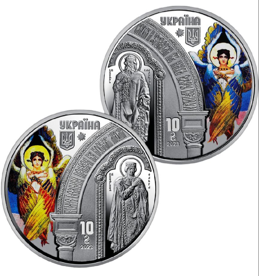На аверсі монет із набору розміщено: угорі – напис УКРАЇНА, малий Державний Герб України; унизу – номінал монет 10 та графічний знак гривні, рік карбування 2023; у центрі розміщено фрагменти центральних воріт собору, на яких зображено княгиню Ольгу та князя Володимира, ліворуч і праворуч від них – серафими, чиї зображення розміщені на центральному куполі собору (використано тамподрук).