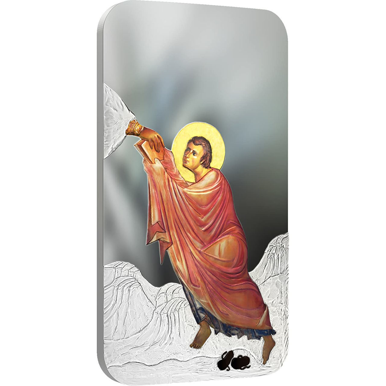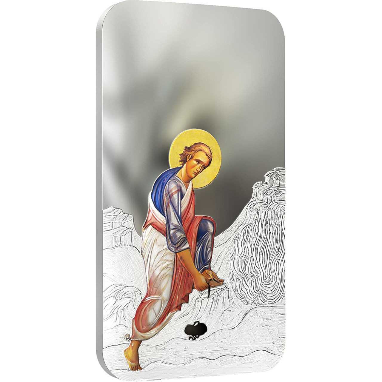 Колекційна монета з чистого срібла 1 унція, присвячена святому апостолу Петру — одному з Дванадцяти та першому Папі Римському. Реверс виконаний у стилі «монета-ікона»: апостол із німбом тримає ключі від Царства Небесного, тло оздоблене орнаментами. Дизайн підкреслено вибірковим золотим покриттям (gilding) та якістю карбування proof. Обмежений тираж — лише 999 штук. Постачається в елегантному футлярі з сертифікатом автентичності.