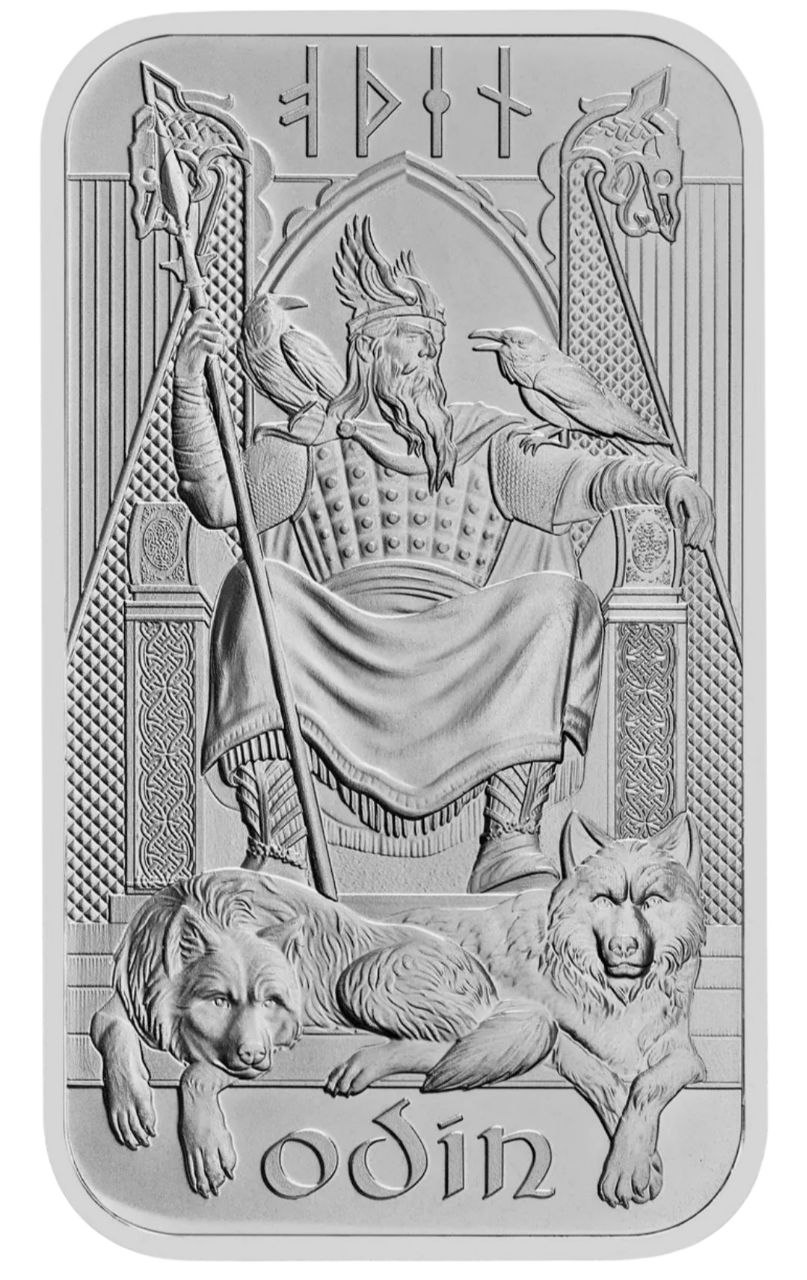 Реверс злитка прикрашає монументальне зображення Одіна, який сидить на троні з двома воронами — Хуґіном і Муґіном, що символізують думку і пам’ять, — та двома вовками Гері і Фрекі біля його ніг. Бог тримає свій спис Гунгнір і зображений у повному обладунку, що підкреслює його владу і мудрість. Над троном викарбувано його ім’я рунічним письмом, а внизу — латинськими літерами «ODIN». Деталі орнаментів і симетрія композиції створюють величну, майже сакральну атмосферу.