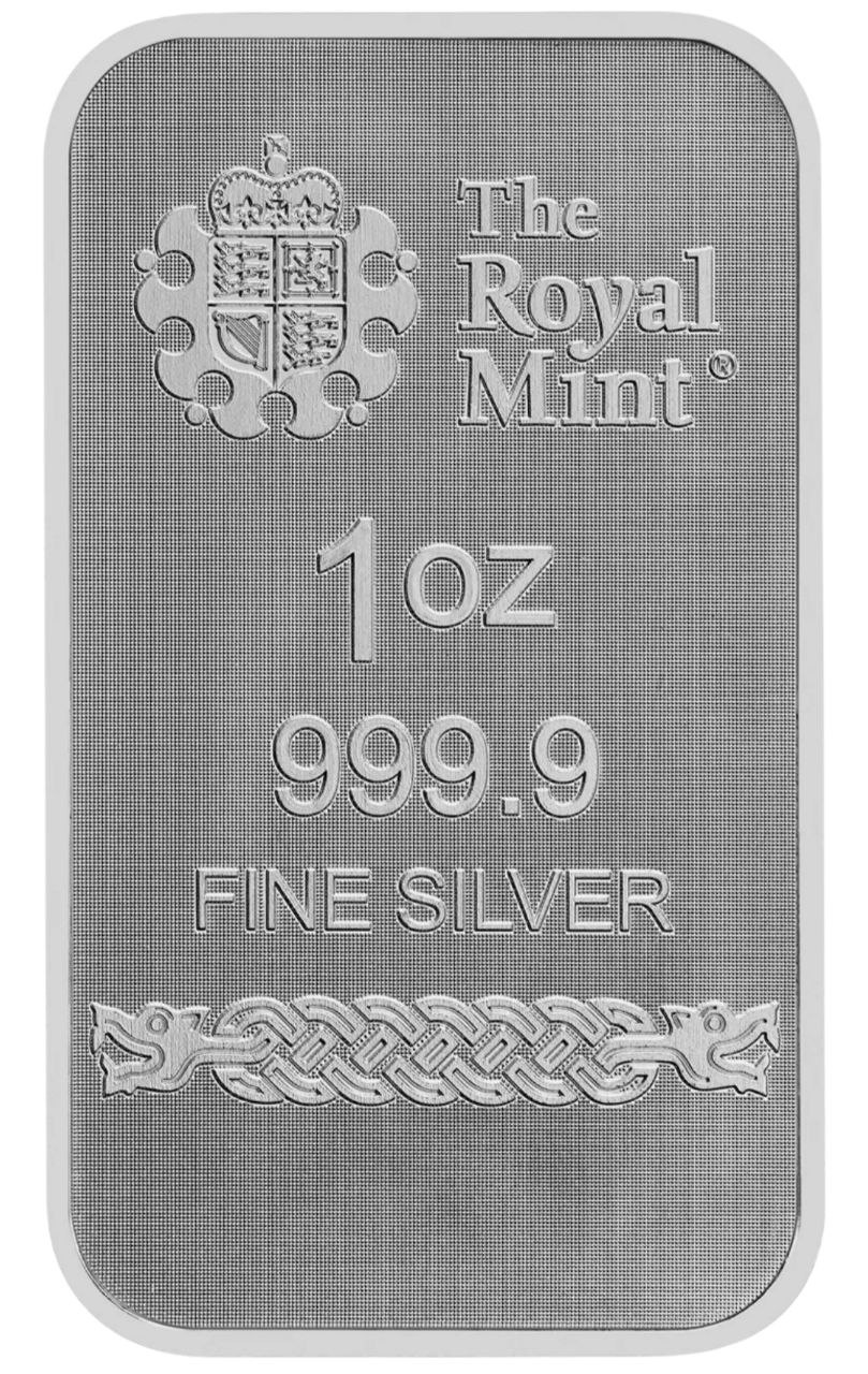 На аверсі зображено емблему Королівського монетного двору Великої Британії — герб із короною та чотирма щитами, що символізує історичну спадщину і державний престиж. Під гербом розташовано надписи «The Royal Mint», «1 oz 999.9 FINE SILVER», які засвідчують вагу й чистоту срібла, а також декоративний вузол із драконячими головами — елемент у стилі кельтського орнаменту.