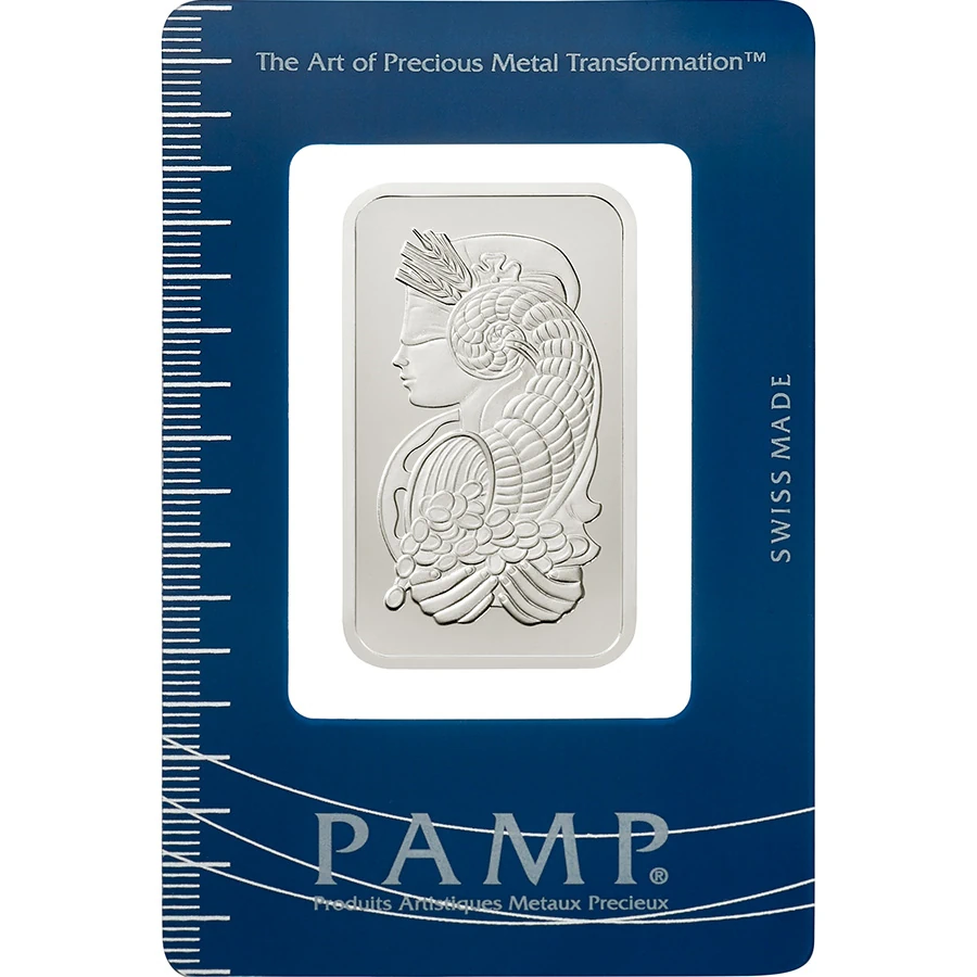 Справжність та серійний номер злитка підтверджені відповідним сертифікатом. Цей зливок від PAMP був першим платиновим зливком. випущений з художнім дизайном. Платиновий злиток “Фортуна” P випускається у вазі 1 грам, 5 грам, 1 унція та 10 унцій, а розмір 1 унція є найпопулярнішим. Крім платини, серія “Фортуна” також виробляється в золоті, сріблі, паладії та родії.