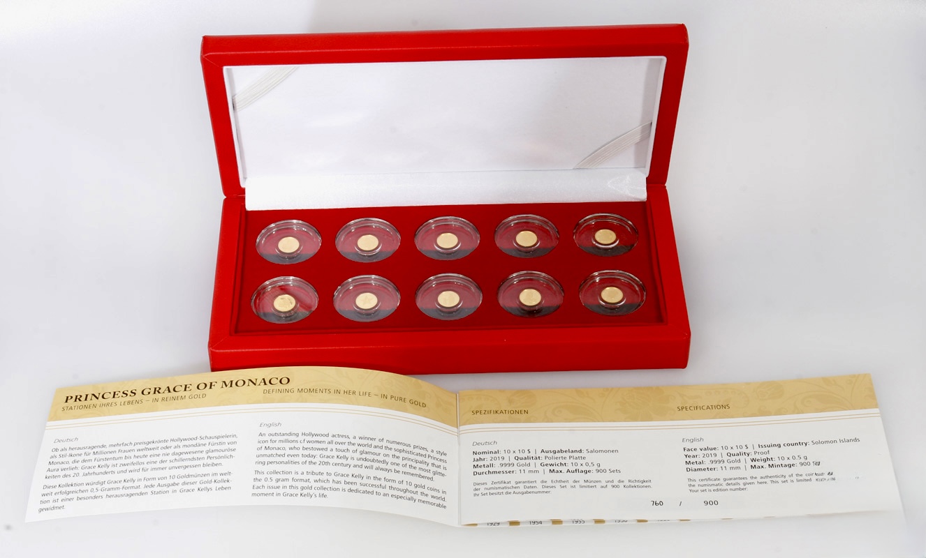 “Принцеса Грейс – Етапи її життя – 10 золотих монет 0,5 г, колекційний альбом”