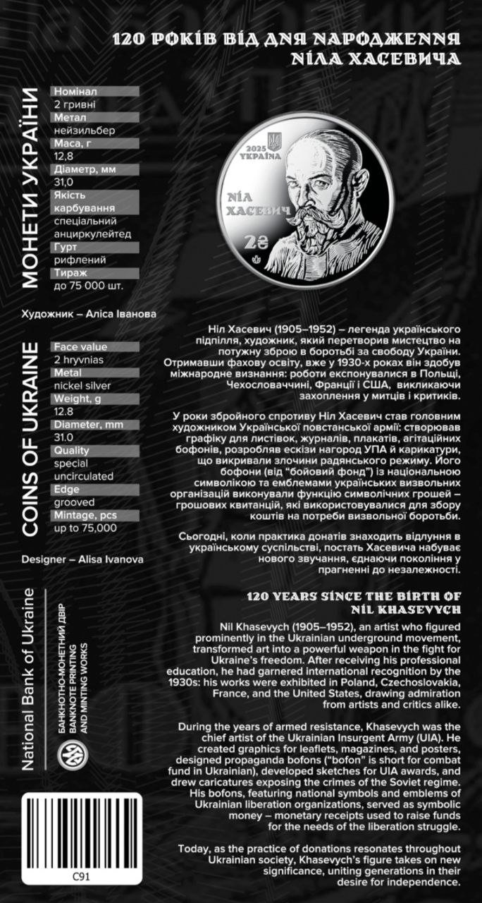 Пам’ятна монета присвячена легендарній постаті українського підпілля, видатному художнику-графіку, учаснику національно-визвольного руху, який перетворив мистецтво на потужну зброю опору.