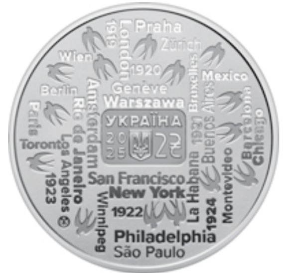 На аверсі монети розміщено композицію, що символізує гастрольну діяльність Української республіканської капели під орудою Олександра Кошиця. На матовому тлі відтворено стилізовану карту гастрольного маршруту, на якій позначено назви міст, де виступала капела. Між назвами міст зображено силуети ластівок – метафора духовного польоту, вільного руху та поширення українського мистецтва у світі. На дзеркальному тлі розміщено: напис УКРАЇНА, рік карбування 20 / 25, малий Державний Герб України, номінал 2 з графічним знаком гривні. Унизу ліворуч зазначено логотип Банкнотно-монетного двору Національного банку України.