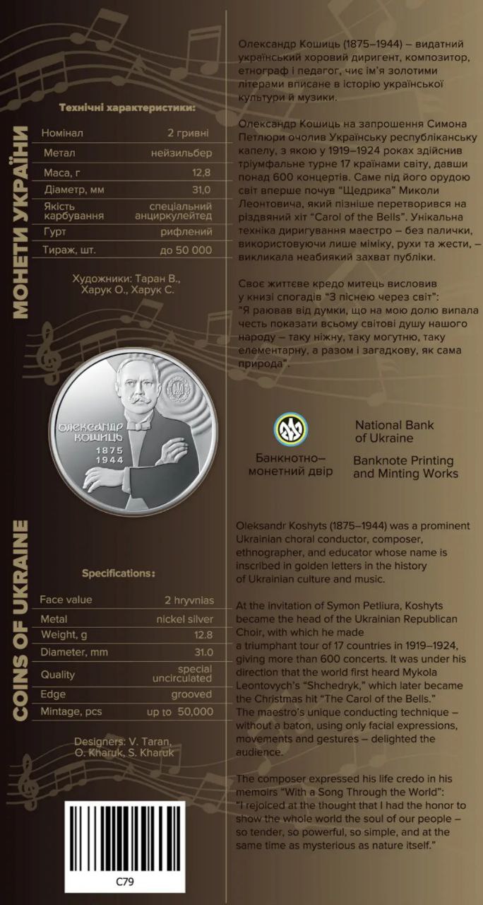 Пам’ятна монета присвячена видатному українському хоровому диригенту, композитору, етнографу та педагогу Олександру Кошицю (1875–1944), який відіграв ключову роль у популяризації української музичної культури на міжнародній арені. Пам’ятна монета вшановує творчу спадщину митця, який на запрошення голови Директорії УНР Симона Петлюри очолив Українську республіканську капелу. Упродовж 1919–1924 років під керівництвом Олександра Кошиця капела здійснила гастрольне турне 17 країнами світу, давши понад 600 концертів. Саме тоді світ уперше почув “Щедрика” Миколи Леонтовича – твір, що згодом став всесвітньо відомим різдвяним хітом “Carol of the Bells”.