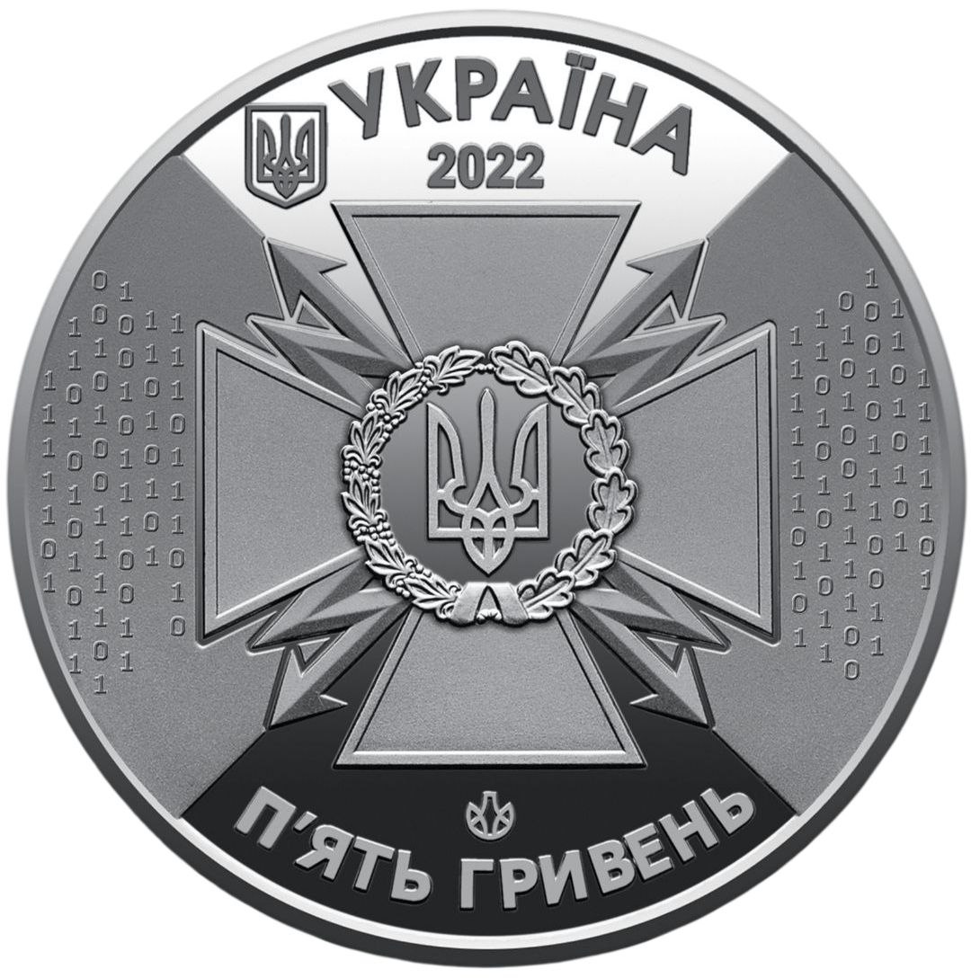 На аверсі монети розміщено: угорі – малий Державний Герб України, праворуч від якого написи УКРАЇНА/2022, у центрі, на тлі стилізовано зображеної інформації у вигляді цифр двійкового коду – емблему Державної служби спеціального зв’язку та захисту інформації України, під емблемою на дзеркальному тлі – логотип Банкнотно-монетного двору Національного банку України та номінал П’ЯТЬ ГРИВЕНЬ (півколом).