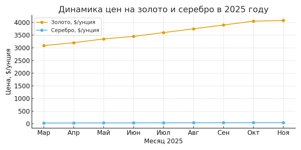 К концу ноября золото торгуется вблизи отметки $4 050 — 4 100 за унцию, что почти соответствует историческим максимумам. Основные причины роста:
