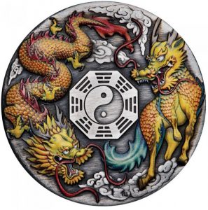Коллекционная серебряная монета «Дракон и Цилинь» 62,2 г 2022 год