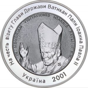 Серебряная медаль «В честь визита Главы Государства Ватикан Папы Иоанна Павла II в Украину» — это памятная нумизматическая реликвия, выпущенная в 2001 году в честь исторического события — первого визита Папы Римского Иоанна Павла II в независимую Украину. Это событие стало символом духовного единства, мира и взаимопонимания между Востоком и Западом христианского мира.