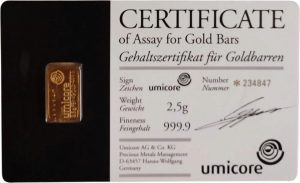 Коллекционный золотой слиток 2.5 грамма UMICORE