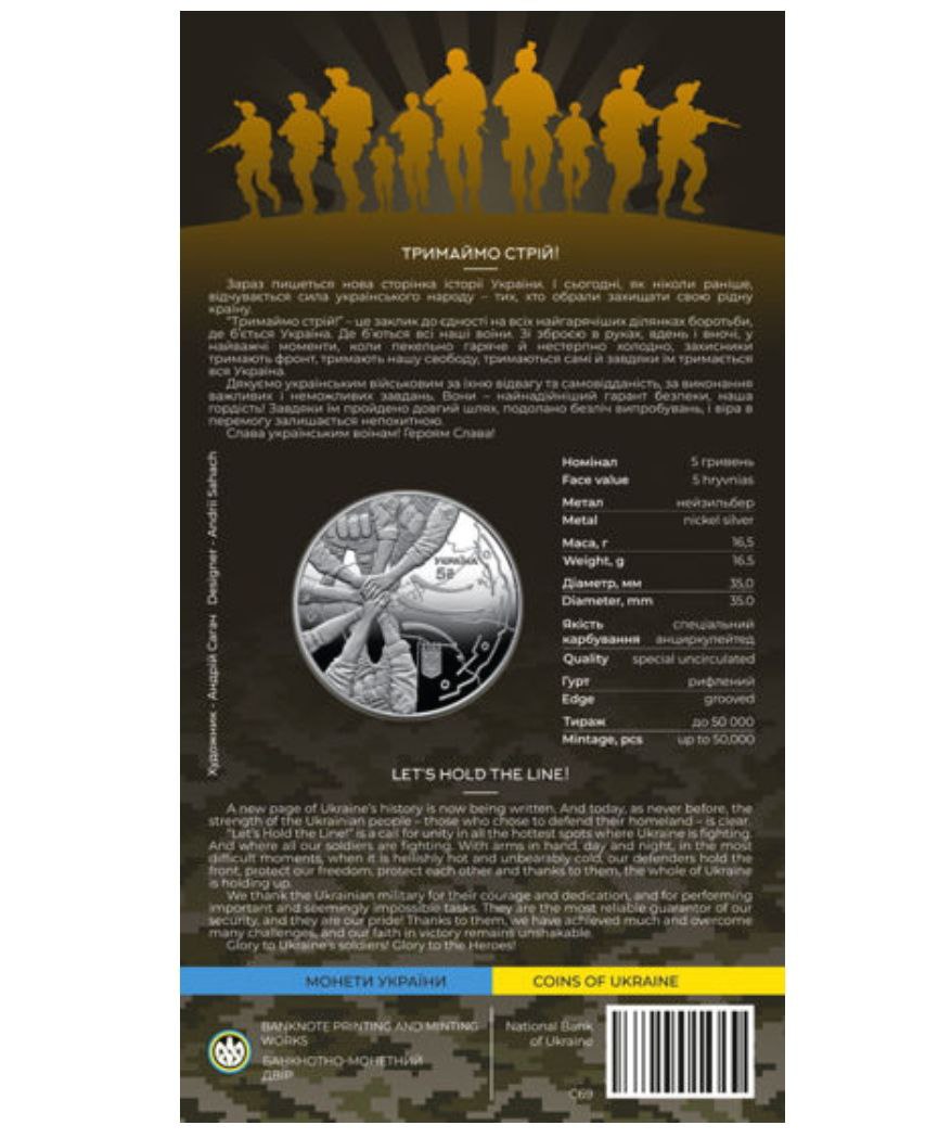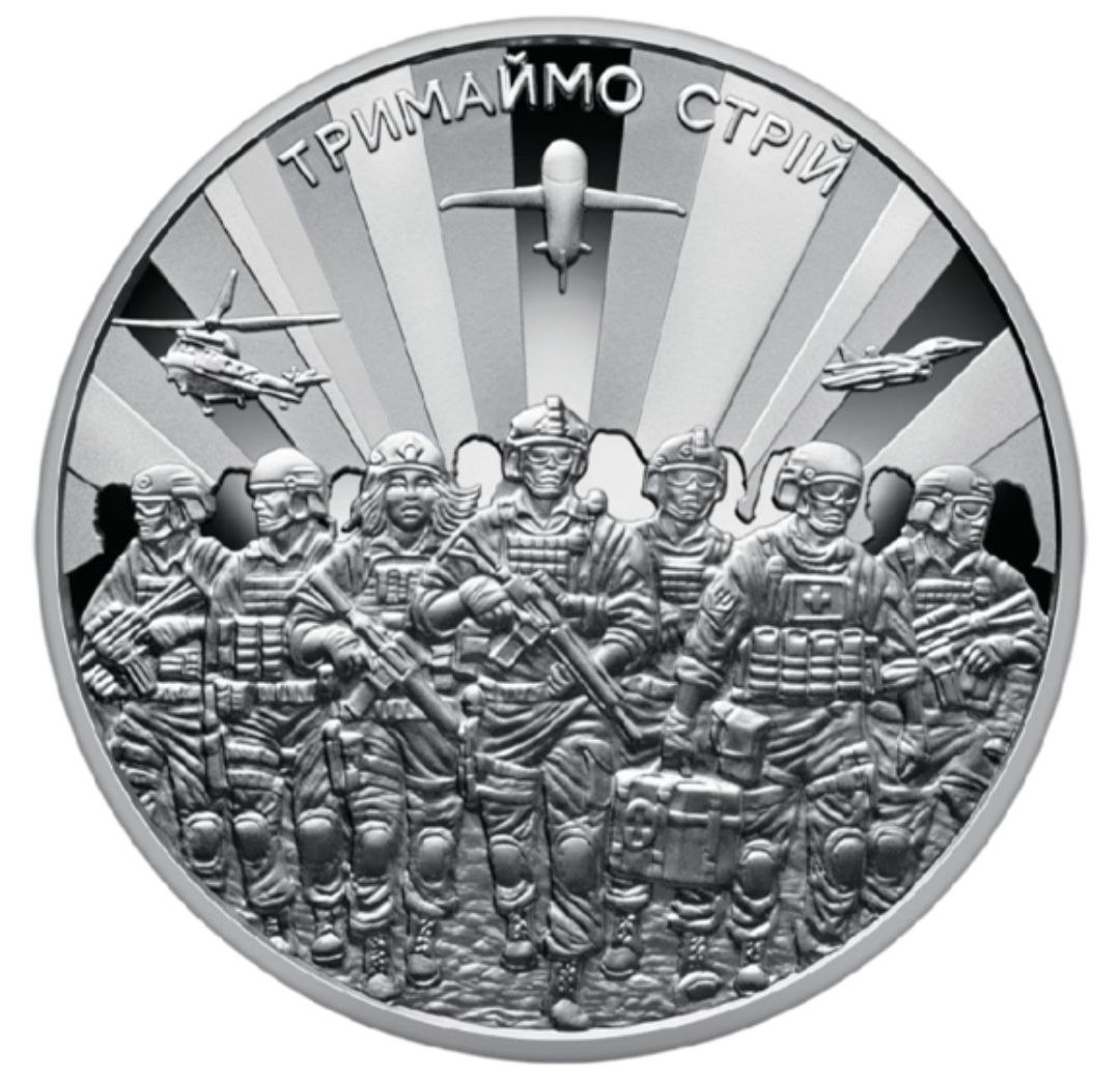 Памятная монета «Держим строй!» посвящена несокрушимости украинских военных. Это призыв к единению на всех горячих участках противостояния, где идет борьба Украины. Эта памятная монета символизирует единство, крепость и мужество наших защитников, которые с оружием в руках день и ночь стоят на защите нашей свободы. Благодаря отваге украинских защитников наша страна одолевает все испытания, и вера в победу остается незыблемой.