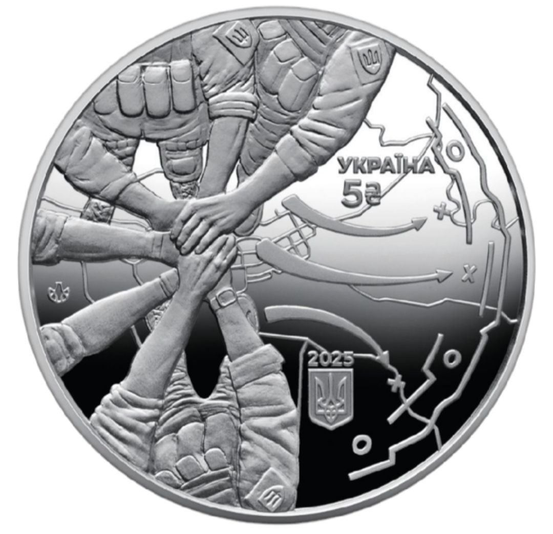 На аверсе монеты на зеркальном фоне изображены украинские защитники, соединившие руки в коллективном рукопожатии в кругу единства. Эта композиция подчеркивает сплоченность перед сражением, готовность к защите родной земли. На заднем фоне схематически изображена топографическая карта местности с обозначенными на ней линиями обороны и направлениями боевых действий, визуально напоминающими трезубец. Справа размещена надпись «УКРАЇНА», номинал «5» и графический символ гривны, год чеканки «2025» и малый Государственный Герб Украины. Слева отмечен логотип Банкнотно-монетного двора Национального банка Украины.