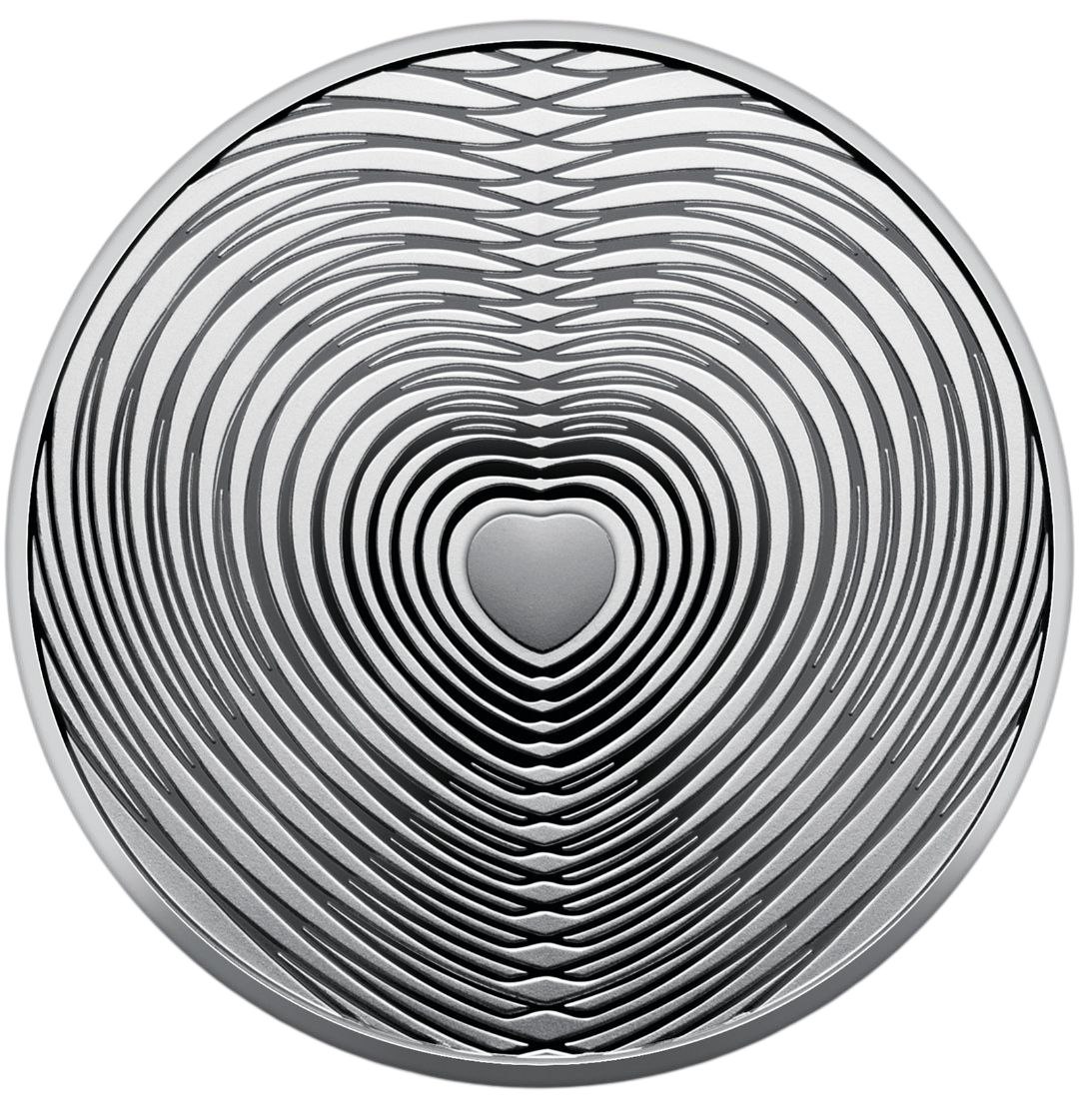 На реверсе монеты на зеркальном фоне рельефно изображено сердце, от которого равномерно расходятся волны. Стилизованная композиция является символом искренней и всеобъемлющей любви, вибрации которой достигают самых сокровенных глубин души.