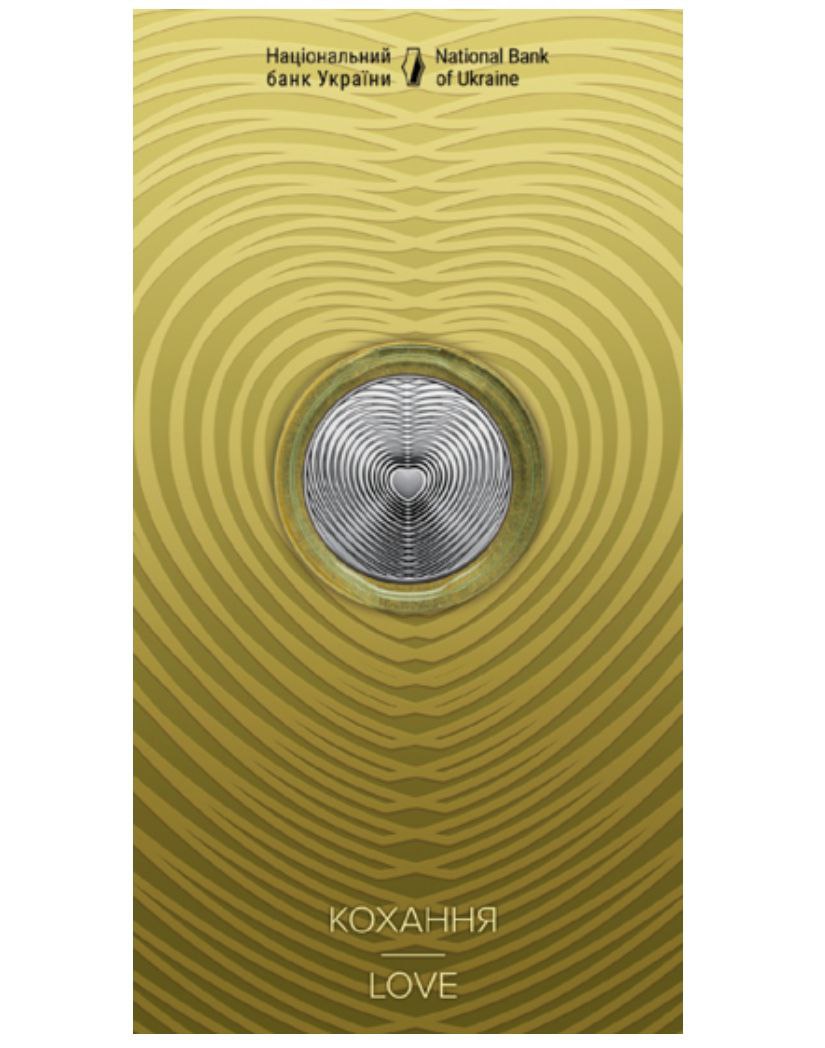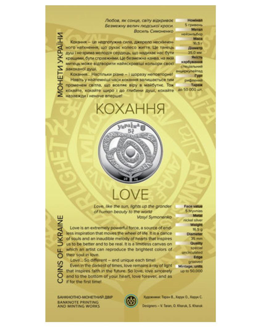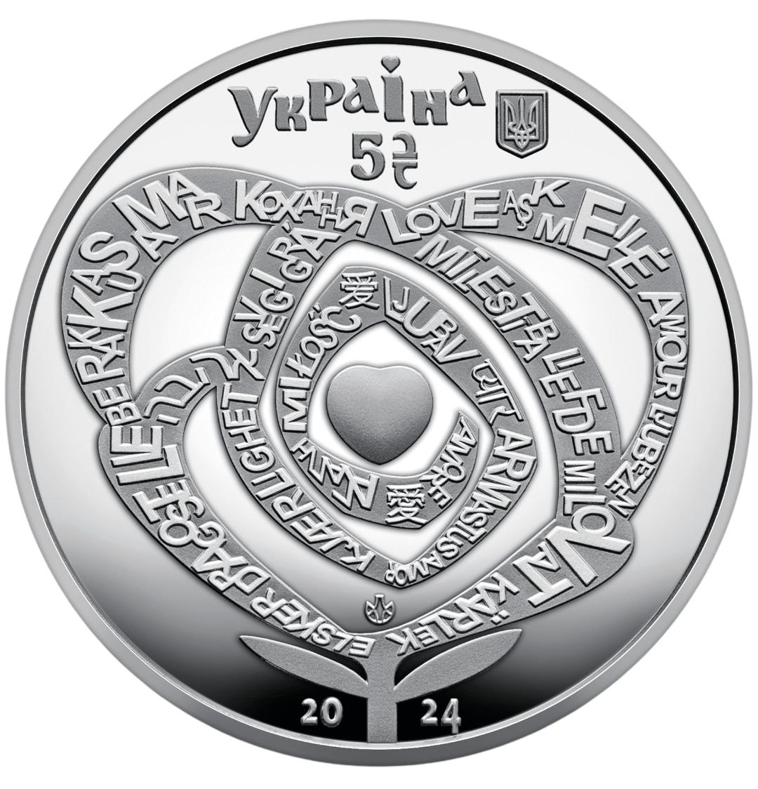 На аверсе монеты на зеркальном фоне размещены: стилизованная в виде сердца роза, в графическое полотно которой вписано слово «любовь» на самых распространенных языках мира, подчеркивающее универсальность и безграничность этого чувства, не знающего границ и языковых барьеров; малый Государственный Герб Украины, надпись УКРАЇНА (точки над буквой «ї» изображены в форме сердца), номинал 5 и графический символ гривны (наверху над розой); логотип Банкнотно-монетного двора Национального банка Украины (над стеблем розы), надпись 20/24 (внизу).
