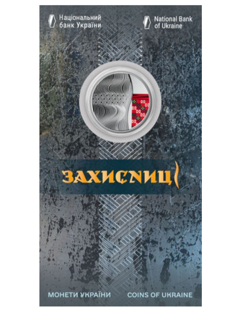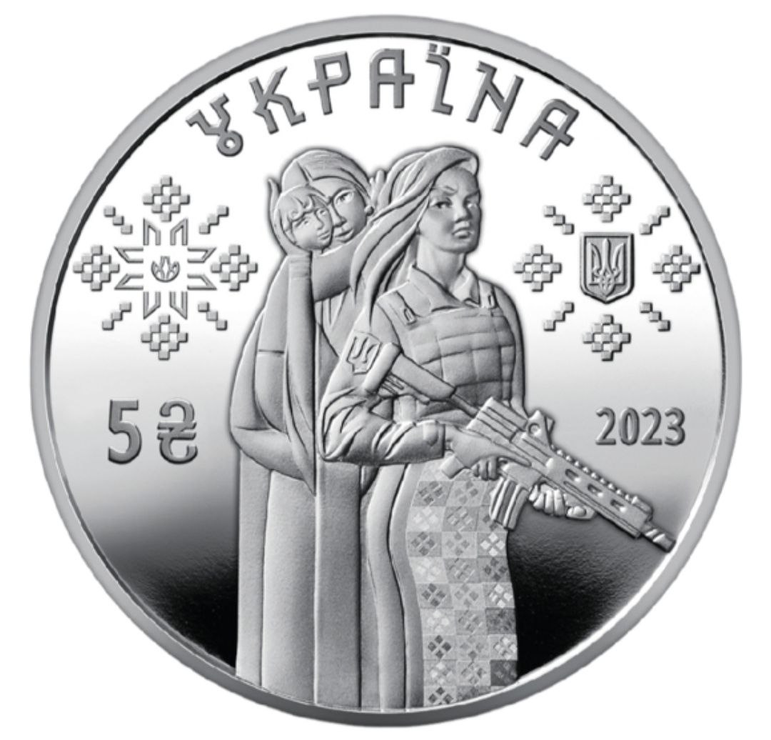 На аверсе монеты на зеркальном фоне размещены символическая композиция, демонстрирующая отважность и свободолюбие, искренность и одновременно нежность, заботливость украинских женщин, воплощенных в образах матери и защитницы, которые во время войны взяли на себя огромную ответственность – быть на защите Родины и одновременно оставаться женой, хозяйкой и матерью (в центре); вверху надпись УКРАЇНА (полукругом), слева от которой изображен логотип Банкнотно-монетного двора Национального банка Украины, украшенный стилизованными орнаментами украинской вышивки, номинал – 5 и графический символ гривны; справа – малый Государственный Герб Украины, украшенный стилизованными орнаментами украинской вышивки, и год чеканки монеты 2023.