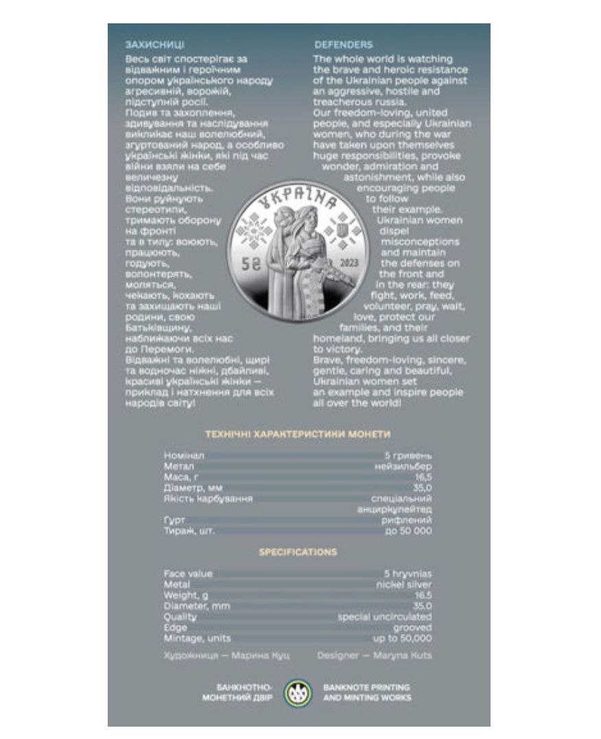 Памятная монета посвящена украинским женщинам. Они разрушают стереотипы, держат оборону на фронте и в тылу: воюют, работают, кормят, волонтерят, молятся, ждут, любят и защищают наши семьи, свою Родину, приближая всех нас к Победе.