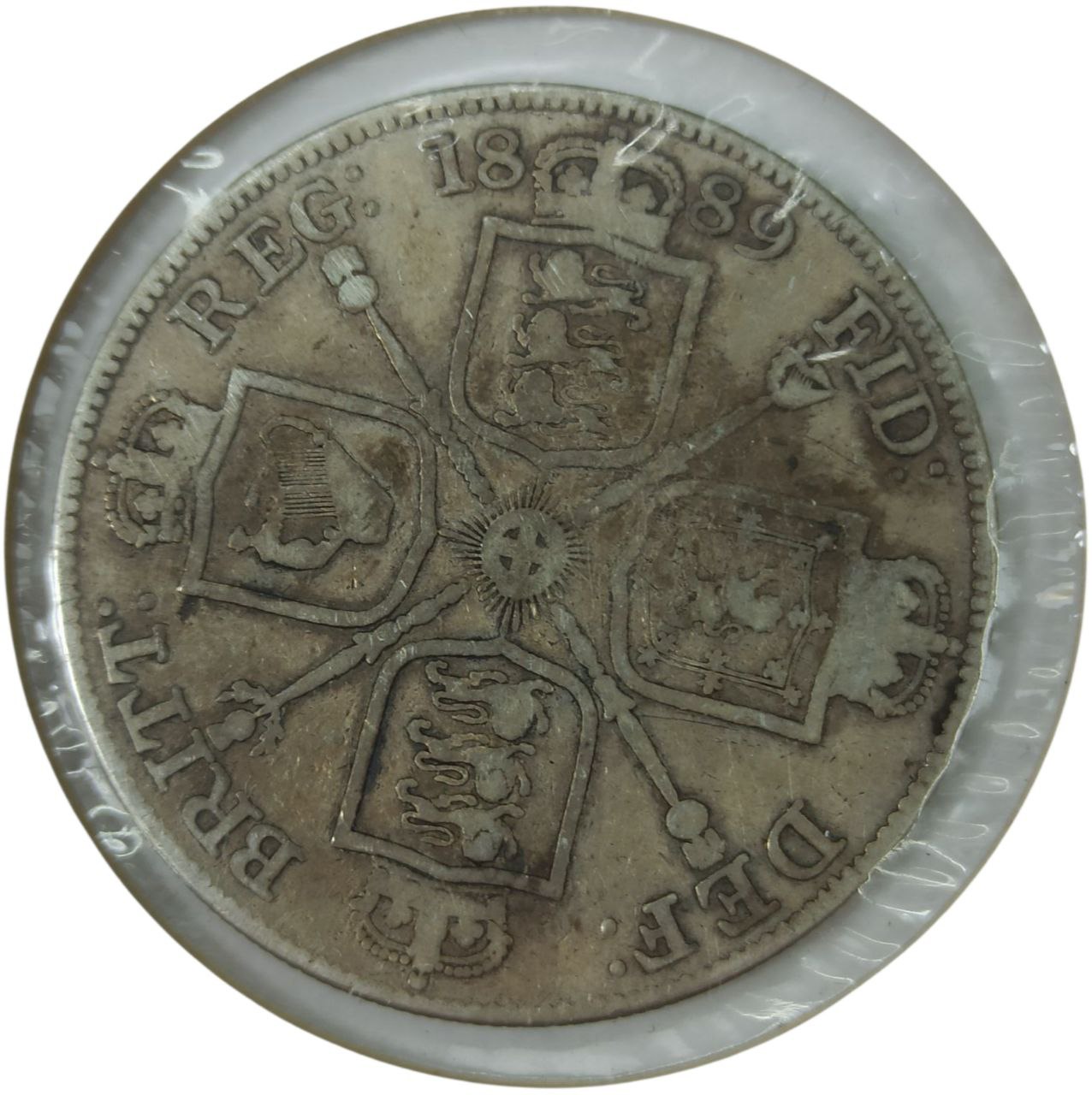 На реверсе изображен сложенный крест из четырех гербовых щитов: Англии, Шотландии и Ирландии, расположенных вокруг центральной декоративной розетки. Между щитами расположены королевские короны. Вокруг композиции проходит надпись «BRITТ. REG. FID. DEF.», что означает «Королева Британцев, защитница веры», а в верхней части указан год чеканки.