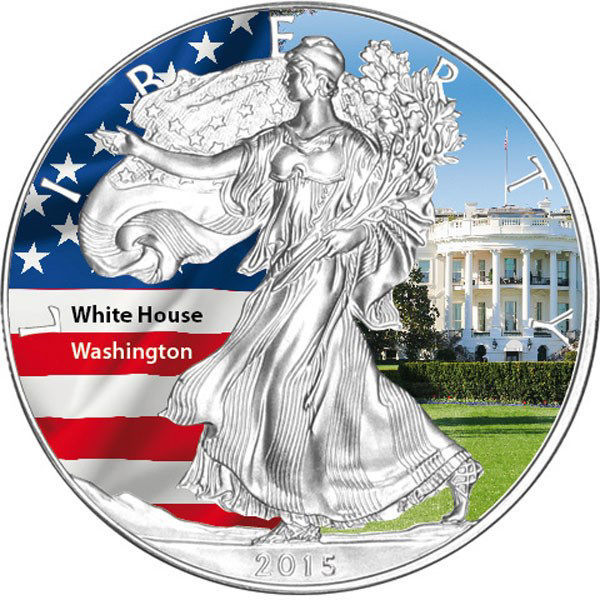 На аверсе монеты изображена фигура «Walking Liberty» — женщина, идущая вперёд, держа в руках ветви лавра и дуба, символизирующие мир и силу. На заднем плане размещено цветное изображение Белого дома — официальной резиденции президента США, на фоне флага Соединённых Штатов. В верхней части надпись «LIBERTY», внизу — год чеканки «2015».