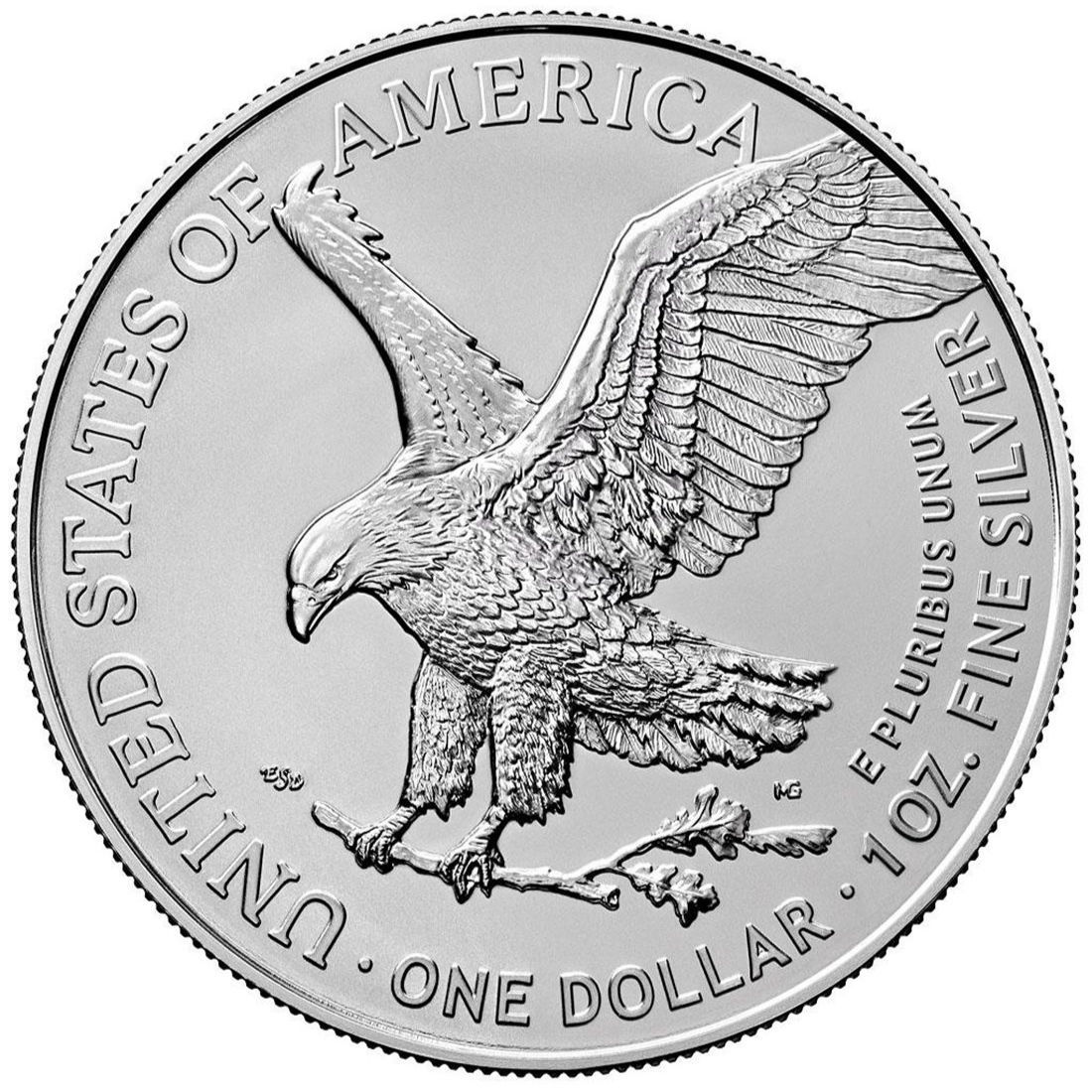 Реверс украшает классический символ американской серии — орёл с расправленными крыльями, садящийся на ветку, которую держит когтями. Рядом выгравирован девиз «E PLURIBUS UNUM» («Из многих — единое»). Вокруг орла расположены надписи «UNITED STATES OF AMERICA», «ONE DOLLAR», «1 OZ. FINE SILVER».