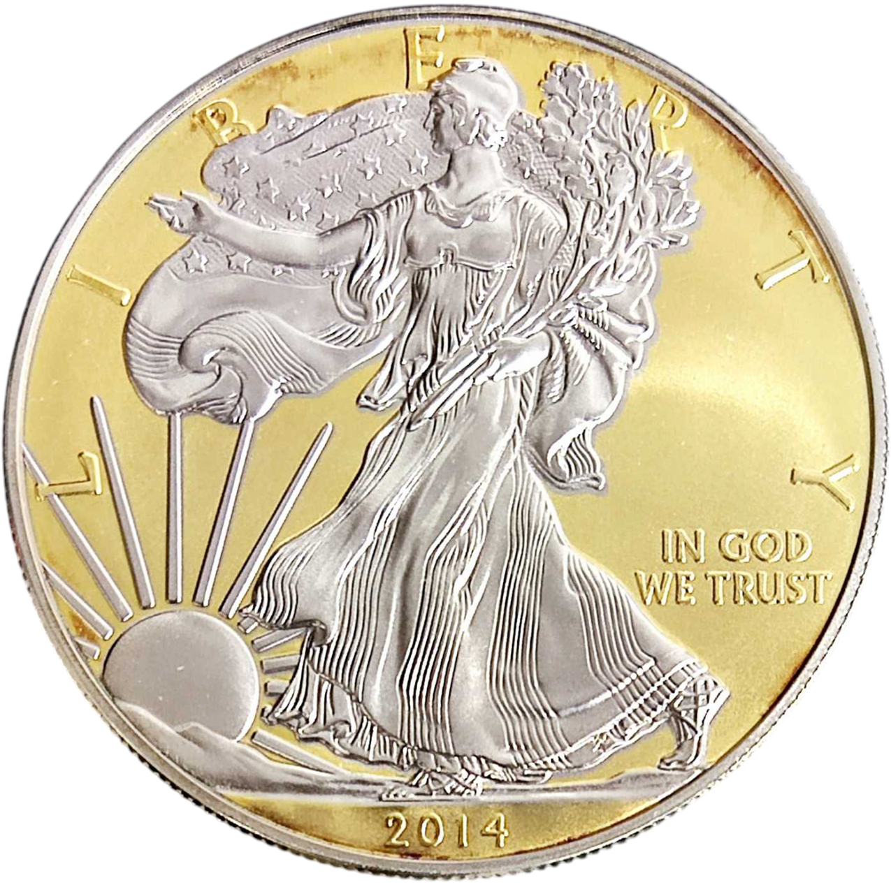 На аверсе изображена знаменитая фигура Леди Свобода, идущая навстречу восходящему солнцу, символизирующему возрождение и надежду. В её руках — ветви лавра и дуба, олицетворяющие славу и силу. Позолоченный фон подчёркивает контраст между зеркальной поверхностью серебра и тёплым сиянием золота, создавая эффект света, разливающегося по монете. Внизу указан год выпуска — 2014, а справа размещён девиз «IN GOD WE TRUST».