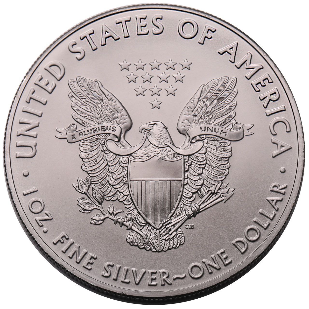 На реверсе монеты представлен геральдический орел США с распростертыми крыльями, который держит стрелы и оливковую ветвь как символы силы и мира. Над орлом изображено тринадцать звезд, символизирующих первые штаты страны. Вокруг реверса размещены надписи «UNITED STATES OF AMERICA» и «1 OZ. FINE SILVER – ONE DOLLAR», указывающие на эмитента, металл и номинал.