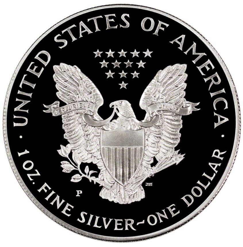 На реверсе монеты представлен геральдический орел США с распростертыми крыльями, который держит стрелы и оливковую ветвь как символы силы и мира. Над орлом изображено тринадцать звезд, символизирующих первые штаты страны. Вокруг реверса размещены надписи «UNITED STATES OF AMERICA» и «1 OZ. FINE SILVER – ONE DOLLAR», указывающие на эмитента, металл и номинал.