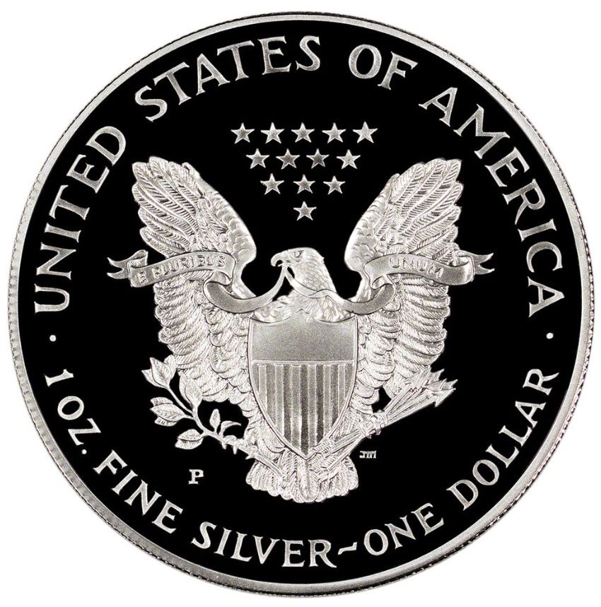 На реверсе монеты представлен геральдический орел США с распростертыми крыльями, который держит стрелы и оливковую ветвь как символы силы и мира. Над орлом изображено тринадцать звезд, символизирующих первые штаты страны. Вокруг реверса размещены надписи «UNITED STATES OF AMERICA» и «1 OZ. FINE SILVER – ONE DOLLAR», указывающие на эмитента, металл и номинал.