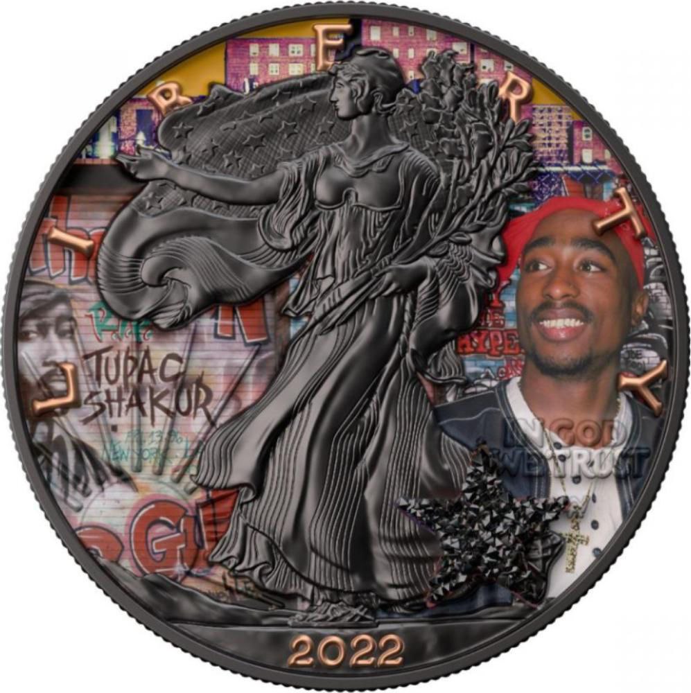 На аверсе изображена знаменитая фигура «Walking Liberty» — аллегория свободы, символизирующая движение Америки вперёд. На фоне стилизованных граффити расположен цветной портрет Тупака Шакура, улыбающегося, словно живого среди огней города. Справа видна надпись «IN GOD WE TRUST», внизу — год выпуска «2022». Сочетание классической символики США и современного уличного искусства создаёт впечатляющий контраст, отражающий культурную эпоху, в которой жил и творил артист.