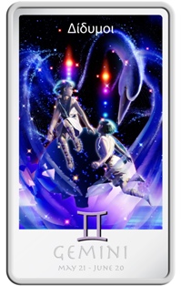 Реверс монеты выполнен в виде космической сцены: два близнеца изображены на фоне звёздного неба, окружённые светящимися энергиями. В верхней части расположено греческое слово «Δίδυμοι», а ниже — знак и надпись «GEMINI». Яркий дизайн отражает свободу, интеллект и внутреннюю гармонию, присущие представителям этого знака.