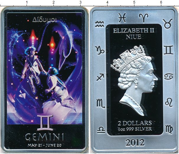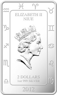 На аверсе изображен профильный портрет королевы Елизаветы II, окружённый символами всех двенадцати знаков зодиака. Надпись «ELIZABETH II NIUE» указывает на страну-эмитента — Ниуэ, а также содержит номинал 2 доллара и пробу серебра 999, что подтверждает подлинность и качество монеты.