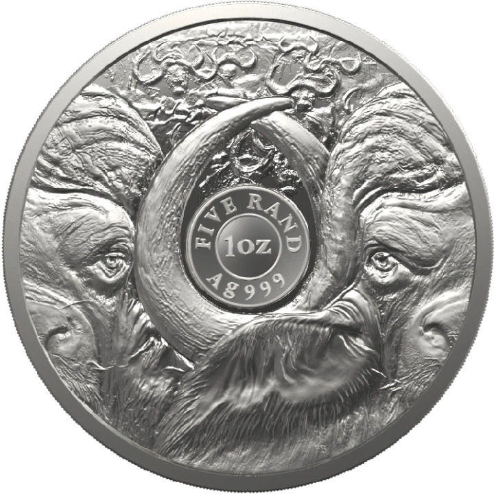На реверсе изображены два буйвола, смотрящих друг на друга, образуя симметричную композицию. В центре расположено кольцо с номиналом «FIVE RAND», весом «1oz» и пробой серебра «Ag 999». Такой дизайн создаёт эффект непрерывности, когда несколько монет можно сложить в единую панораму.