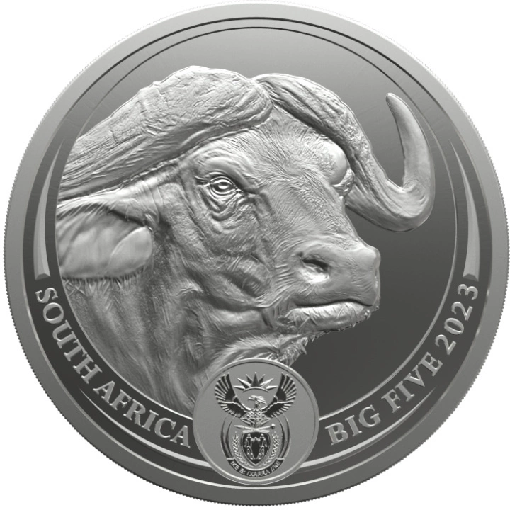 Аверс монеты украшен детализированным портретом буйвола, передающим его величие и природную мощь. Над изображением размещены надписи «SOUTH AFRICA» и «BIG FIVE 2023», а под ним — герб Южной Африки, символизирующий национальную гордость и наследие страны.