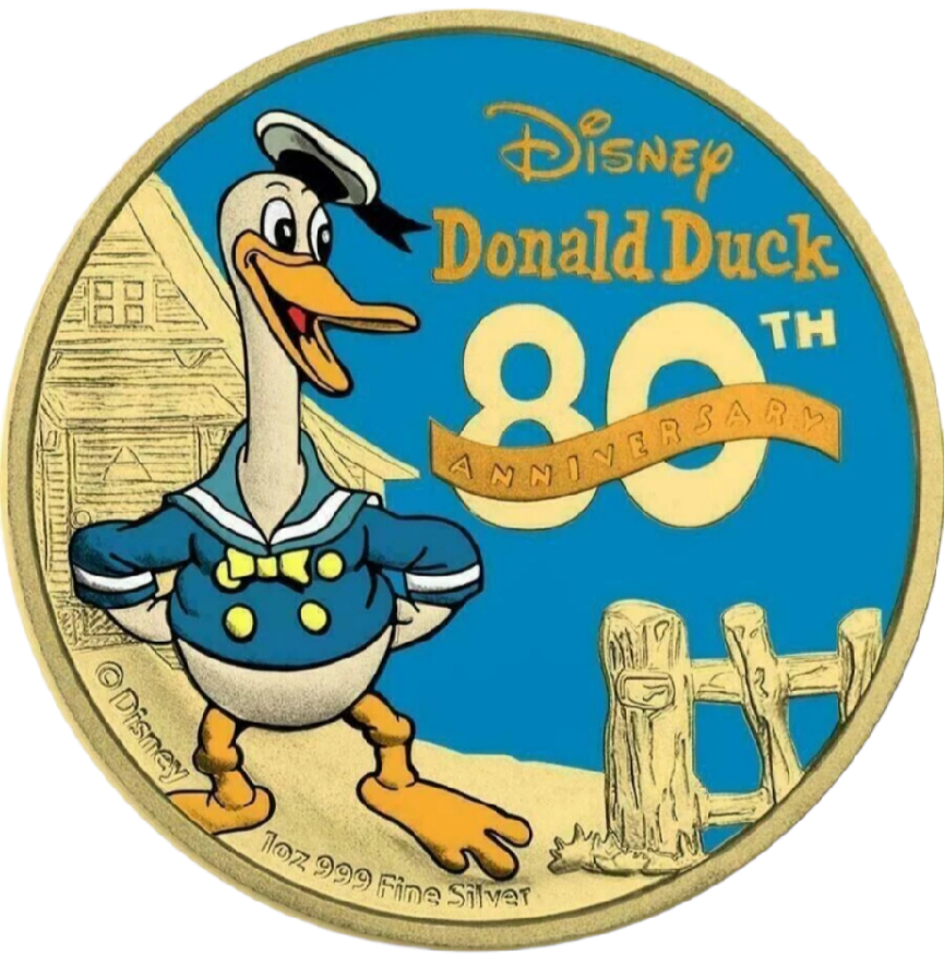 Реверс посвящён Дональду Даку — легендарному персонажу компании Disney. Он изображён в своей классической синей матроске с жёлтым бантом, стоя на фоне стилизованной фермы. Справа крупными буквами обозначено «80th ANNIVERSARY», а надпись «Disney Donald Duck» выполнена в фирменном стиле компании. Благодаря цветной печати монета выглядит ярко и живо, точно передавая характер любимого героя.