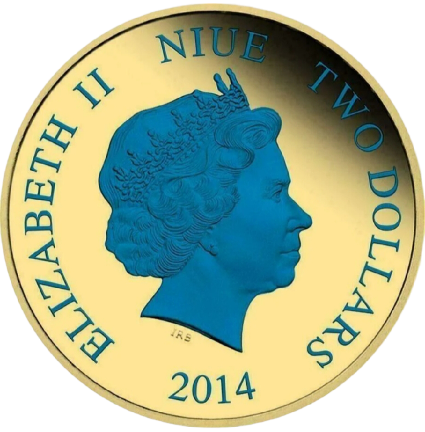 На аверсе изображён портрет Её Величества королевы Елизаветы II. Вокруг портрета расположены надписи «ELIZABETH II», «NIUE», «TWO DOLLARS» и год выпуска — «2014». Зеркальное поле подчеркивает официальный статус монеты как законного платёжного средства и придаёт ей благородный блеск.