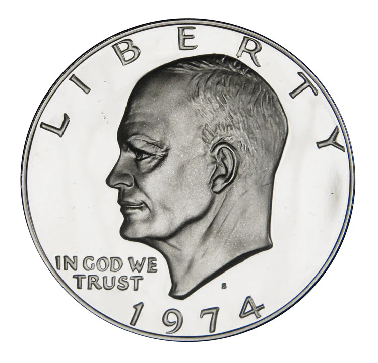 Серебряная монета «Eisenhower Dollar» 1974 года — одна из самых известных американских монет номиналом один доллар, выпущенных в память о 34-м президенте США Дуайте Дэвиде Эйзенхауэре. Она является первой долларовой монетой, чеканенной после серии «Peace Dollar» (1921–1935), и сочетает в себе историческое значение, символику космической эры и мастерство гравировки.
