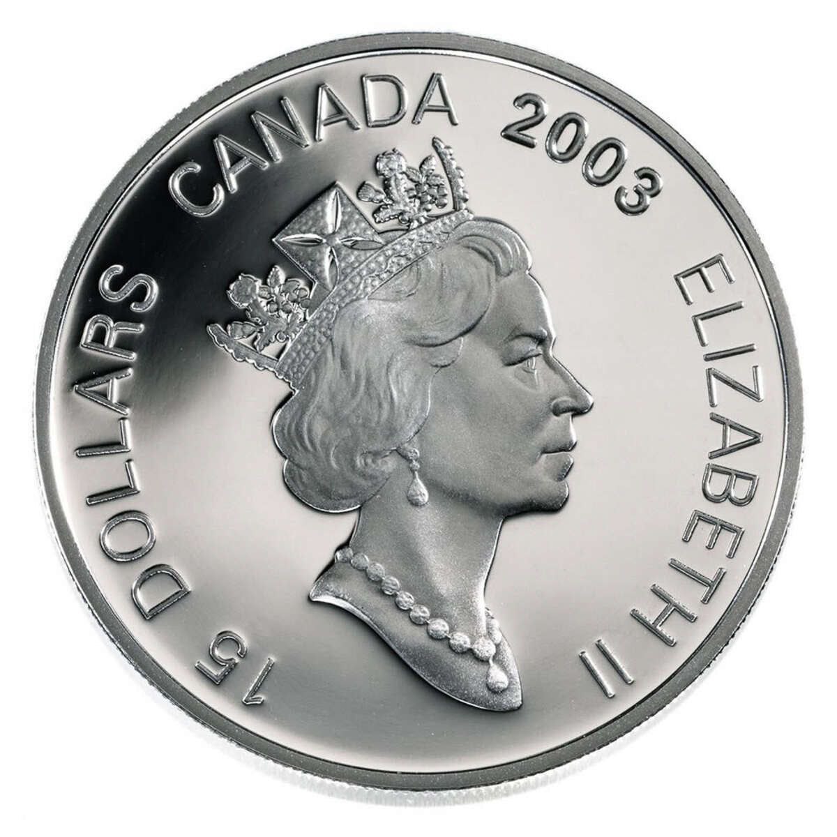 На аверсе представлен классический портрет Её Величества королевы Елизаветы II в профиль. Вокруг изображения расположены надписи «ELIZABETH II», «CANADA», «2003» и номинал «15 DOLLARS». Зеркальный фон аверса контрастирует с чёткими рельефными деталями, создавая ощущение глубины и изящества.