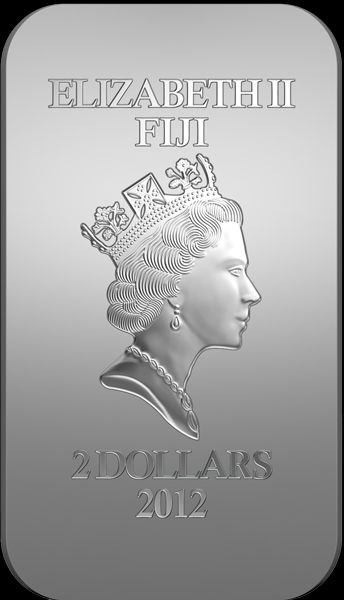 Реверс монеты содержит традиционный профильный портрет Её Величества Королевы Елизаветы II с надписями «ELIZABETH II», «FIJI», «2 DOLLARS» и годом выпуска «2012». Зеркальная поверхность придаёт монете торжественность и блеск.