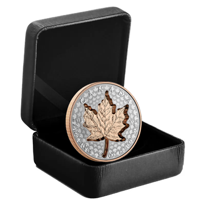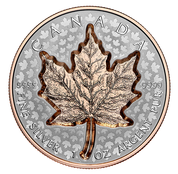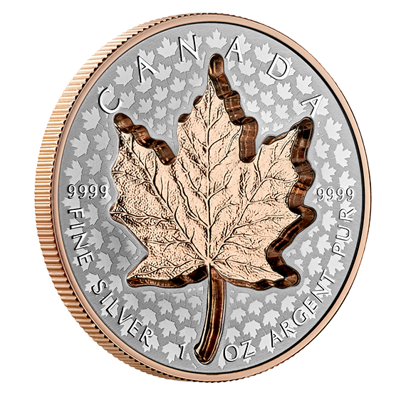 Реверс демонстрирует главный символ Канады — кленовый лист, полностью покрытый розовым позолочением. Тонкая гравировка передаёт природную структуру листа, создавая эффект глубины и объёма. На поле монеты размещены надписи «CANADA», «9999» и «FINE SILVER 1 OZ ARGENT PUR», подтверждающие чистоту серебра 9999 пробы и вес одной тройской унции.
